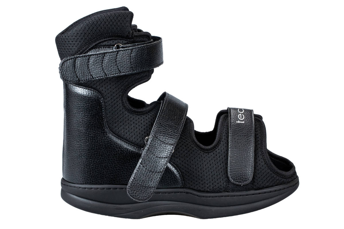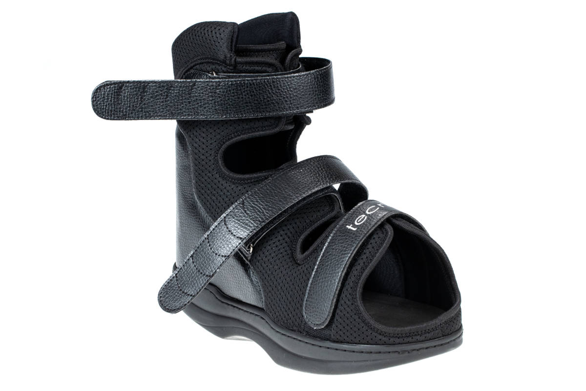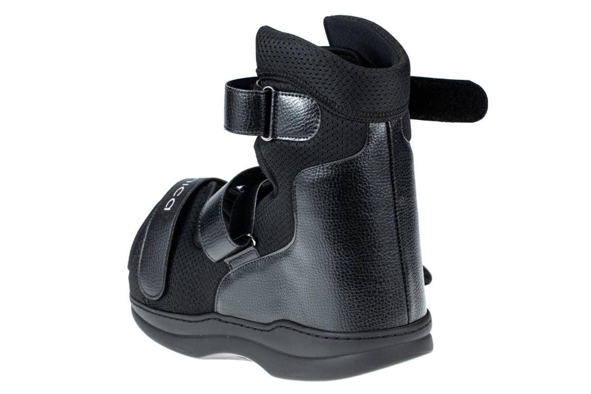 Tutore gamba-piede basso adattabile al paziente. La suola con controllo del movimento e redistribuzione del carico pressorio decomprimono le zone interessate dalla ferita migliorando sensibilmente la deambulazione ed i tempi di guarigione.